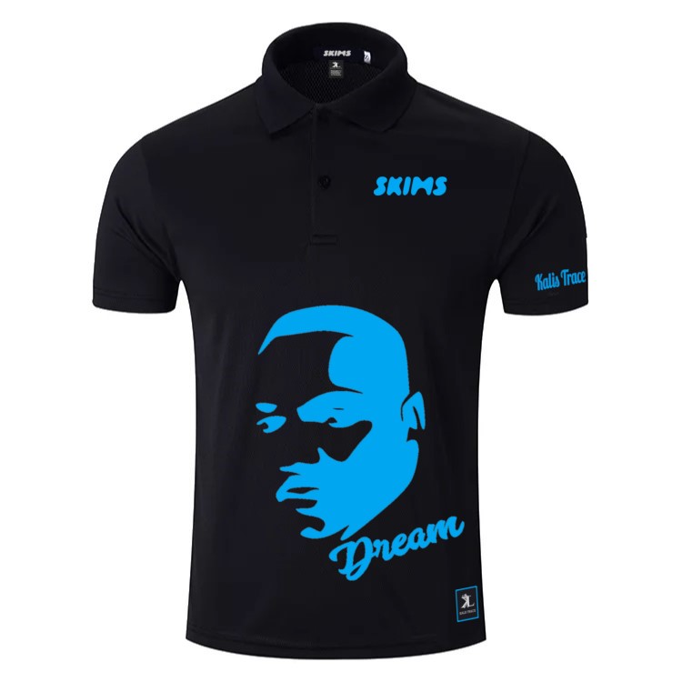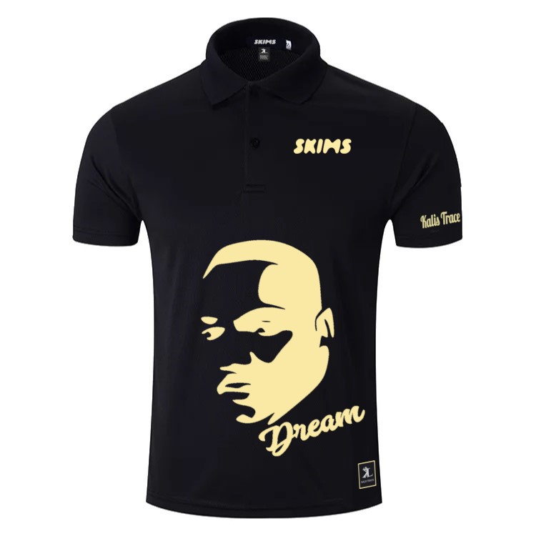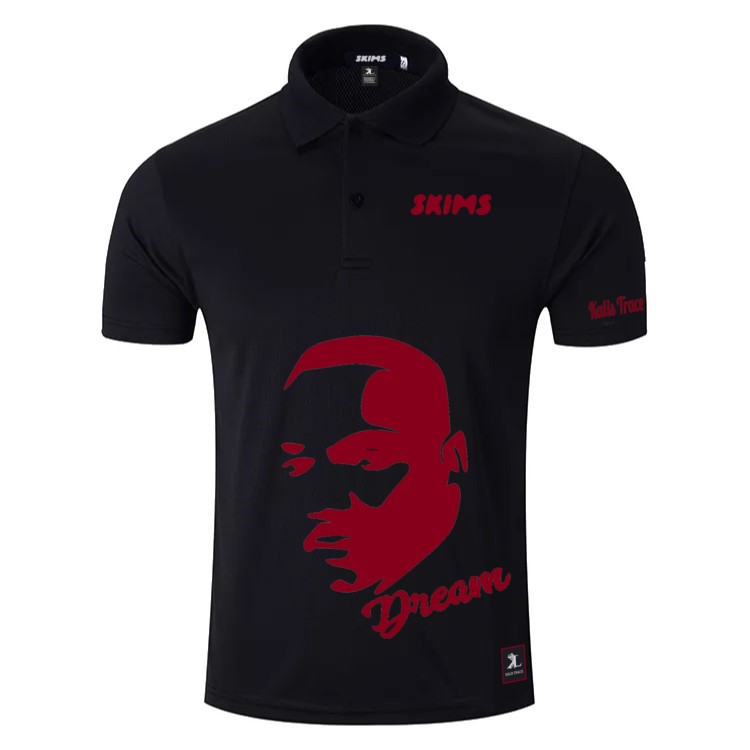 Casual short-sleeved polo shirt, made with cotton fibers, and cotton lining. A buttoned shirt collar. Ribbed sleeves with a rubberized KALIS TRACE signature on the left sleeve. A rubberized logo patch with the SKIMS signature woven on the left chest of the polo shirt. A MARTIN LUTHER KING figurine rubberized on the front with the DREAM logo signature. SKIMS logo signature rubberized on the back. The SKIMS logo signature and KALIS TRACE woven inside the polo shirt.