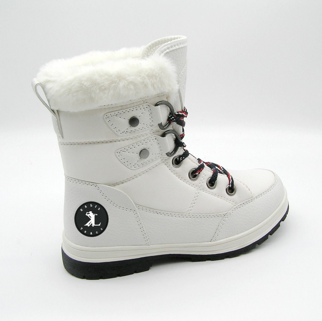 KALIS TRACE FURUD ZETA BOOTS in white, gray and beige. Ideal boot for winter season reaching to the ankles, designed with genuine leather and polyurethane material, having a plush interior lining. Woven ankles with a careful plush lining, for the comfort of your ankles in the shoe. Woven laces on the front, attach to two small woven leather belt on the sides, with a metal buckle. A woven leather patch with the KALIS TRACE signature. A KALIS TRACE logo label, with the name of the model, as well as the description of the maintenance of the boot, woven inside the leather patch. A small woven leather band on the tendon. A woven leather upper lining above the soles, and around the shoe. A rubberized KALIS TRACE logo patch woven on the outer side of the tendon. Ethylene vinyl acetate midsoles and rubber outsoles with a lightweight upper heel. They are non-slip, also have a thermal function.