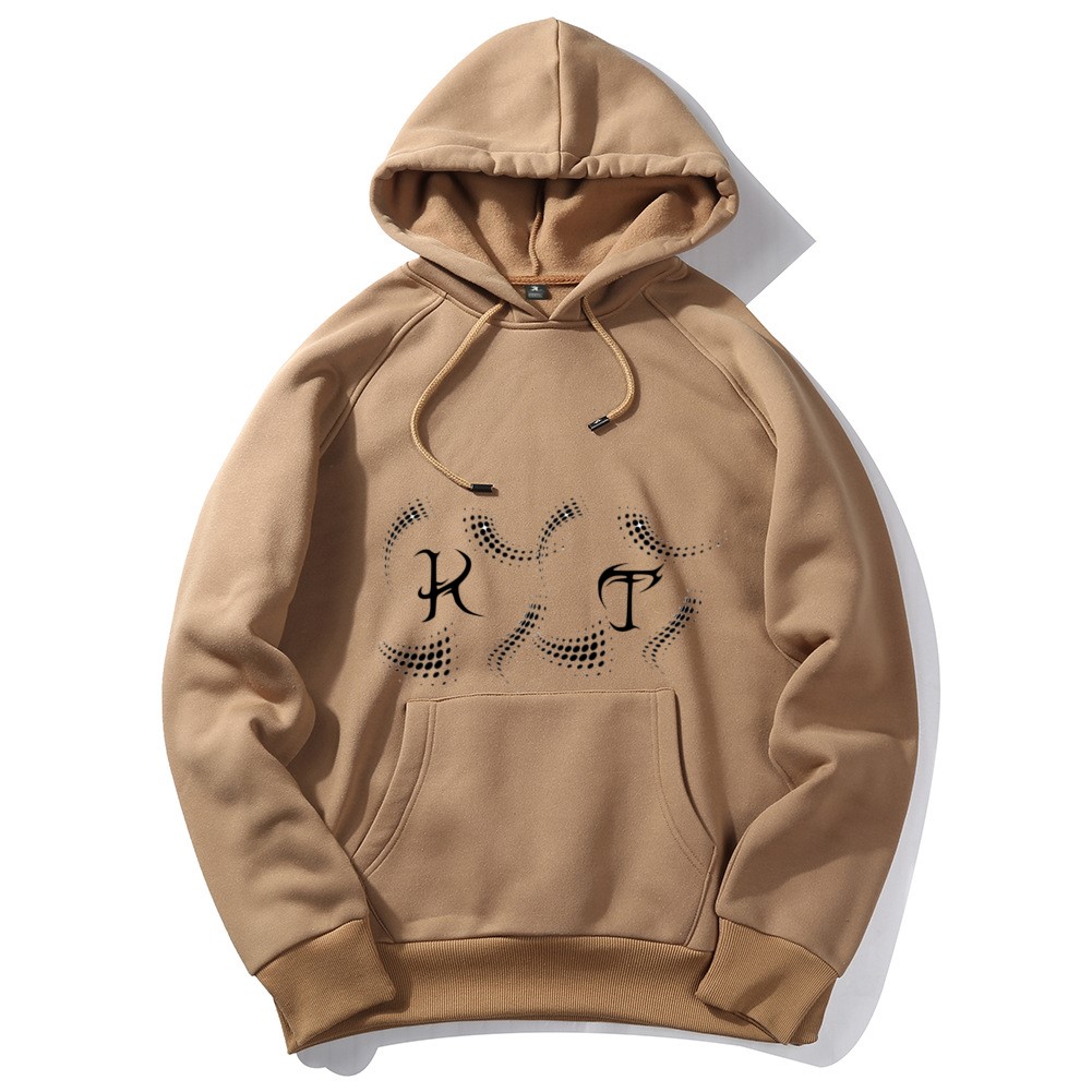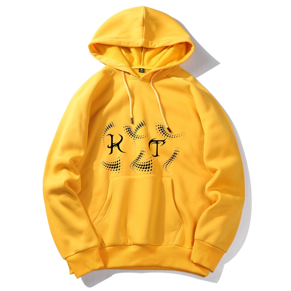 KALIS TRACE GENUBI Sweat-shirt in yellow, brown, dark gray, light gray, light green, dark brown, red and white. Hooded sweatshirt having a woven construction with a cotton lining. A large woven hood on the collar. A woven cord inside the hood. Ribbed cuffs with fleece lining. A ribbed waistband with fleece lining. A large woven kangaroo pocket on the front. A designer design representing a string of bubbles printed with a high quality lining on the front of the jacket, having the KALIS TRACE “KT” insignia in gothic lettering. A KALIS TRACE logo label with the washing description woven inside the jacket.