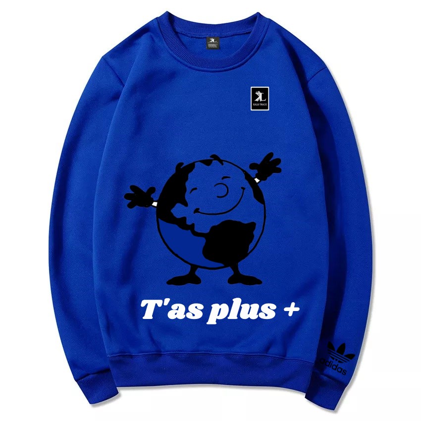 Long sleeve t-shirt with a cotton construction. A ribbed round neck. A woven KALIS TRACE logo patch on the left chest. Ribbed sleeves with rubberized ADIDAS signature. A figurine of PLANET smiling saying “T’AS PLUS +” rubberized on the front. The KALIS TRACE and ADIDAS signature woven inside the t-shirt.